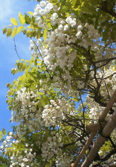 ご近所の保/育園には、枝垂れ桜が1本と、小さい藤棚(白・紫各1本)が